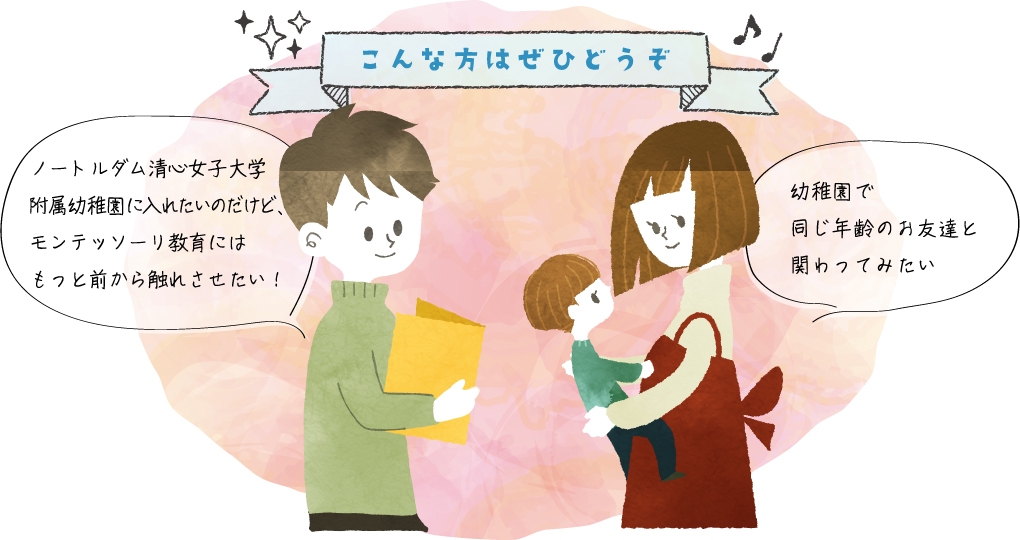 | 対象 | 就園1年前(2023年4月2日~2024年4月1日生)の幼児 本園の入園をご検討されている方に限らせていただきます。 (ただし、入園面接は必要となります) |