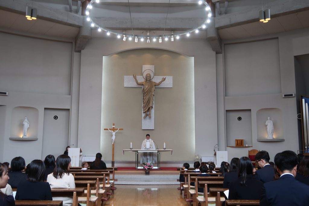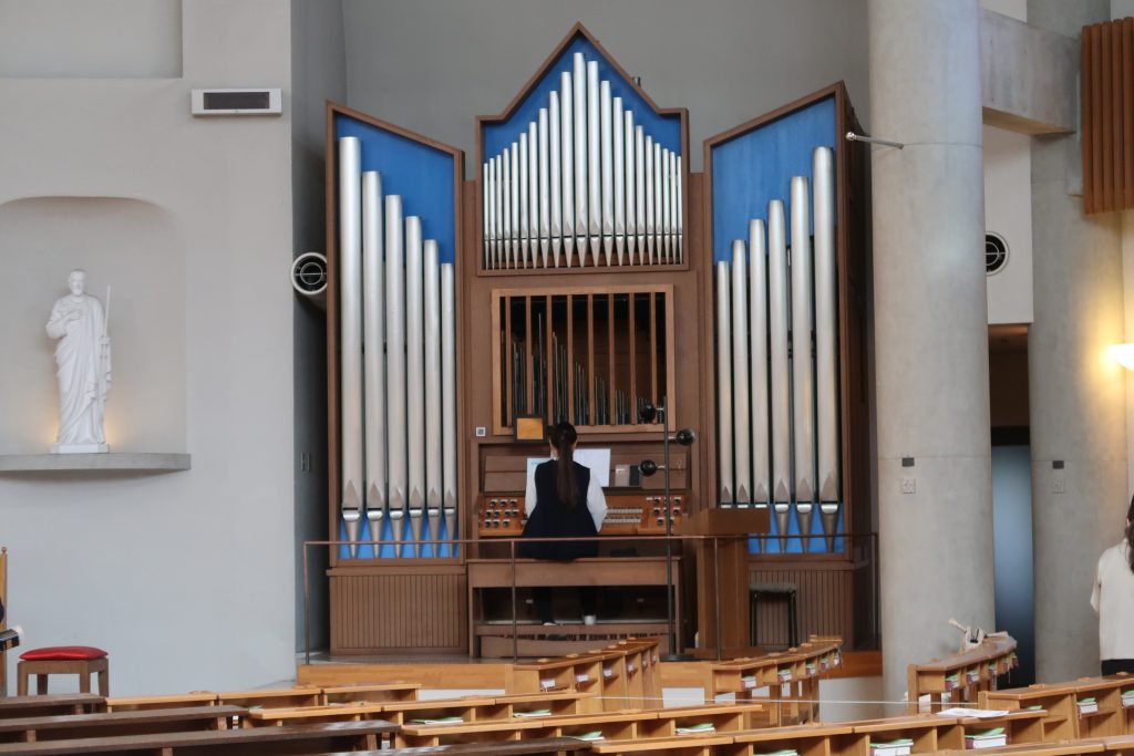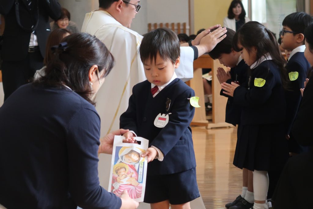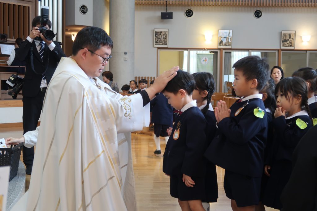 11月12日(水)は子どもの祝福式でした。 祝福式というのは日本で言う七五三でカトリックの風習。 子どもたちがこの歳まで無事に育ってくれたことに感謝して、これからの成長を願う儀式です。 パイプオルガンの音色に包まれながら聖歌を歌い、 神父さまから祝福をいただきました。 そして子どもたちの成長だけでなく、世界の平和や幸せを願い皆でお祈りをしました。